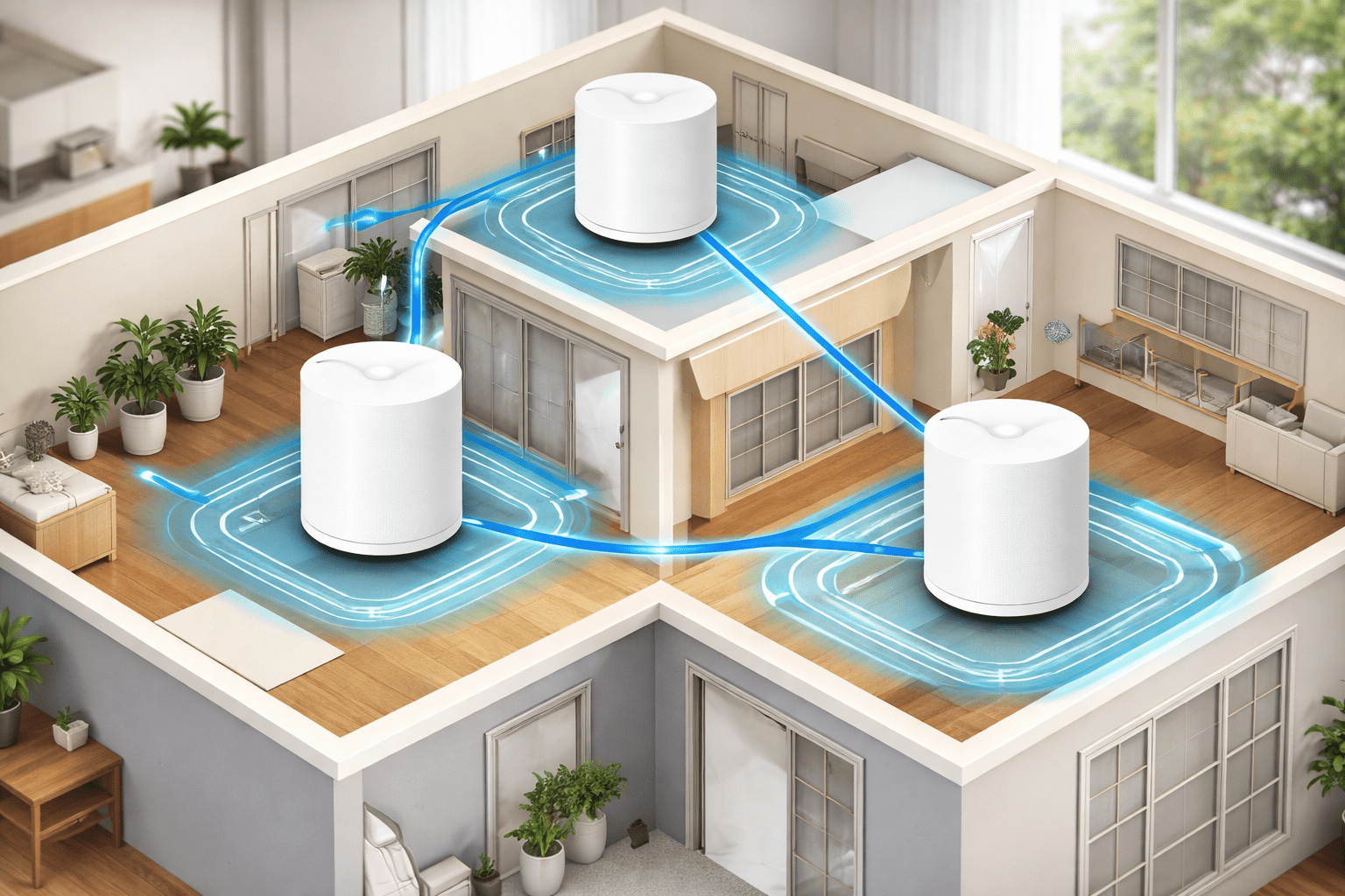 A WiFi Mesh system consists of a main router and multiple satellite nodes placed strategically across your property.
